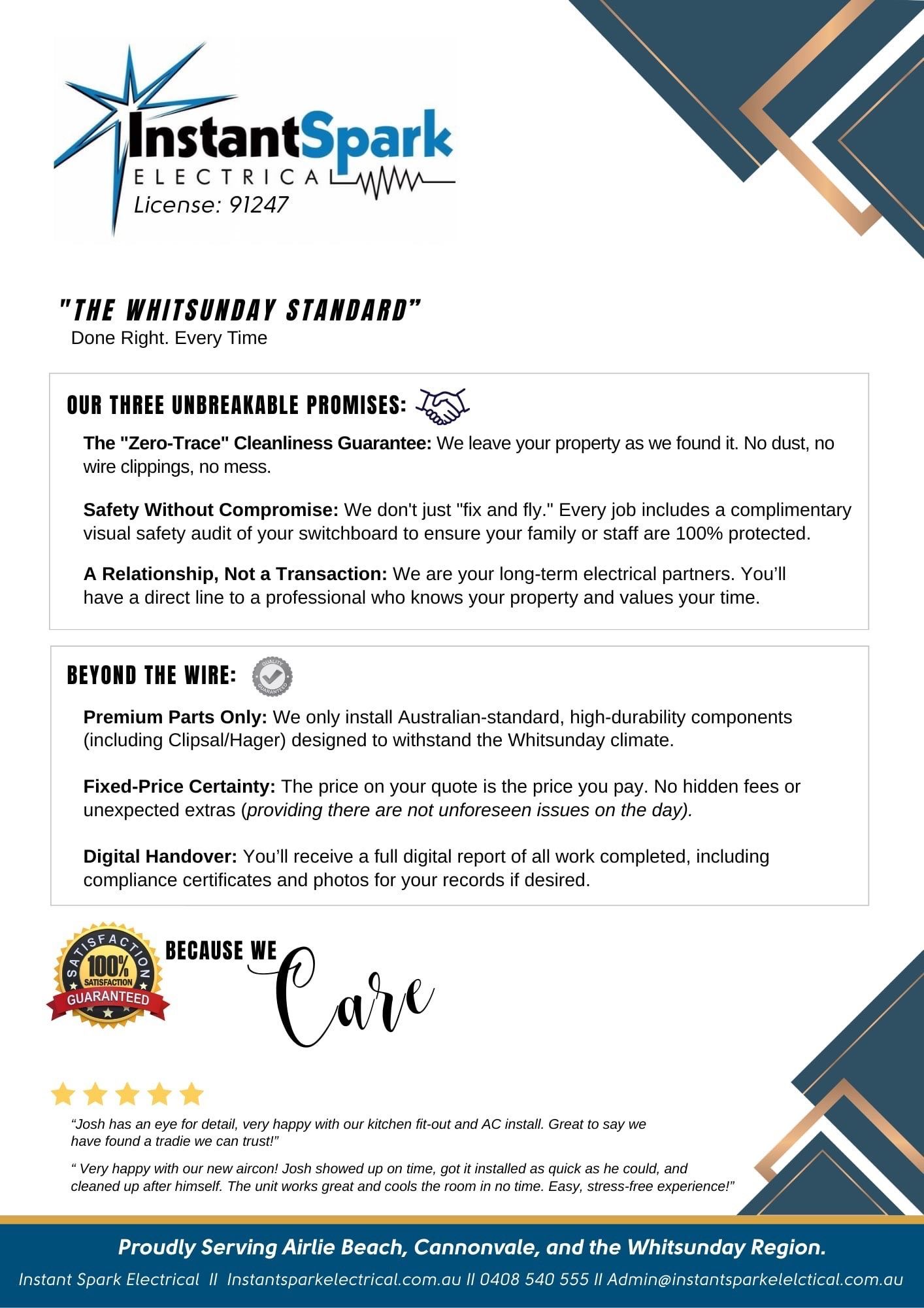 Homeowners and businesses across the Whitsundays trust Instant Spark Electrical for dependable electrical and air conditioning services carried out with care and attention to detail. Our focus is simple — provide work that is completed properly, communicate clearly and deliver a level of service clients feel confident relying on.